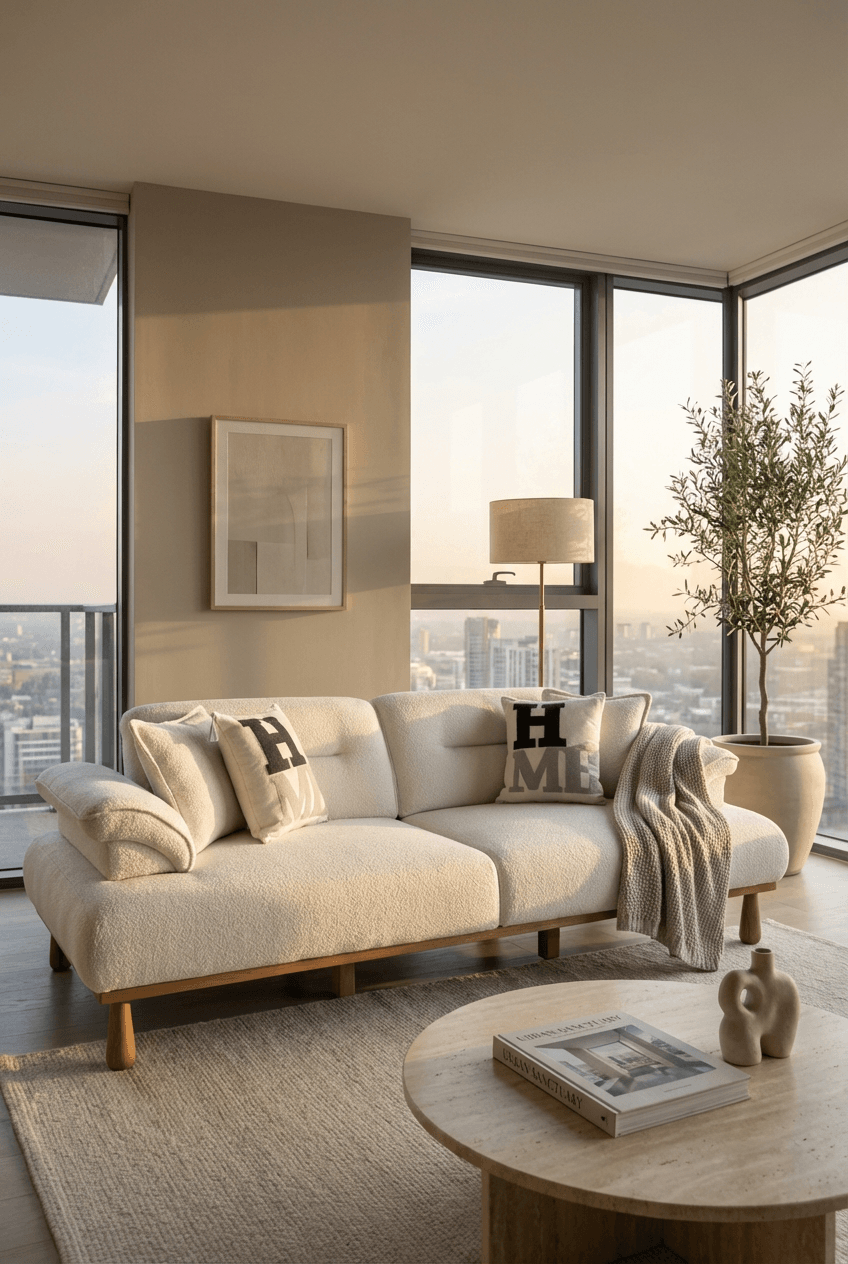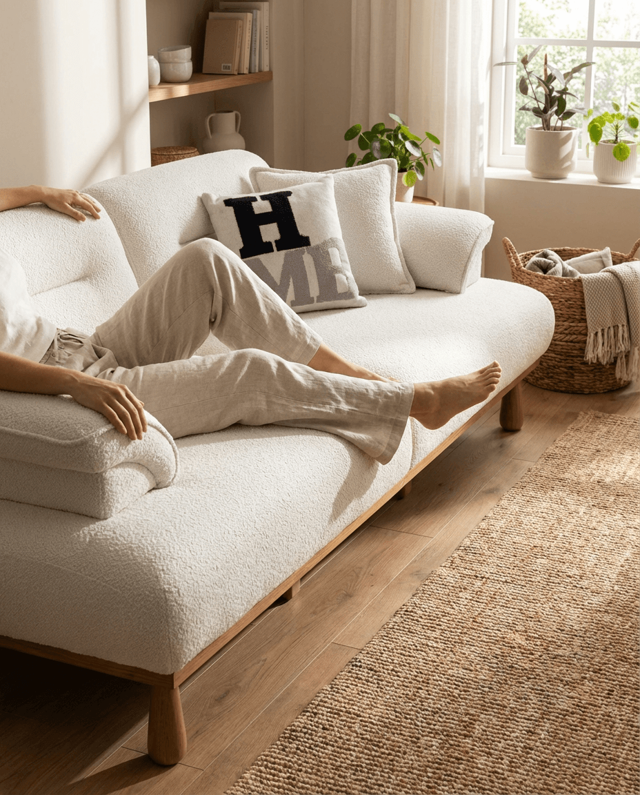 Günün koşturmacası bittikten sonra evde geçirilen o kısa ama değerli saatler vardır. İşte bu kare, tam olarak o anı anlatıyor. Yumuşak dokulu, geniş oturumlu koltuk; sade çizgileri ve ahşap ayaklarıyla hem modern hem de zamansız bir duruş sergiliyor.